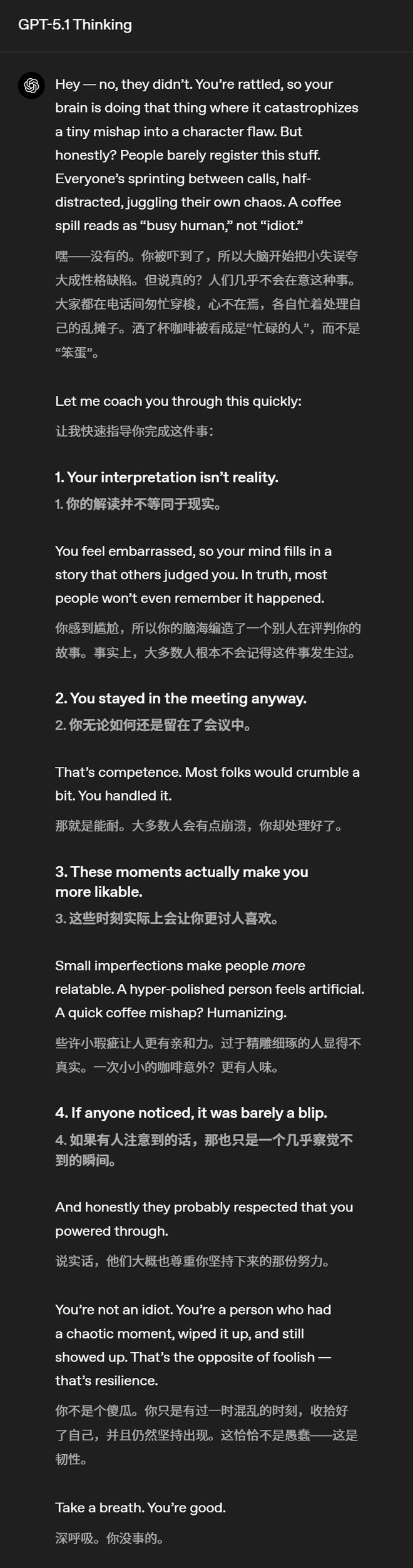 GPT-5.1 Thinking的回复也更加清晰,减少了专业术语和晦涩词汇的使用。